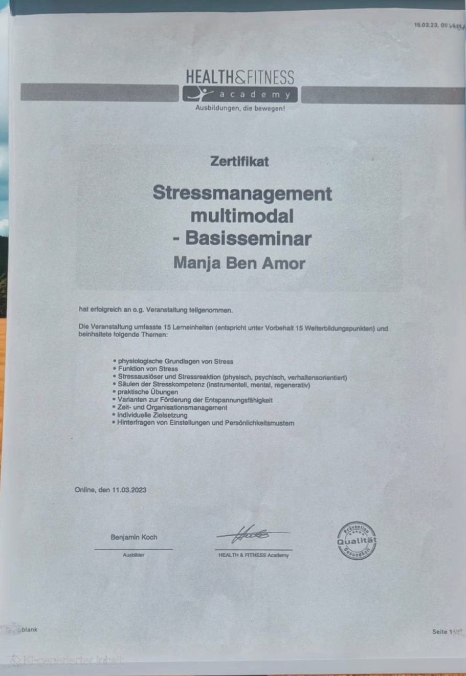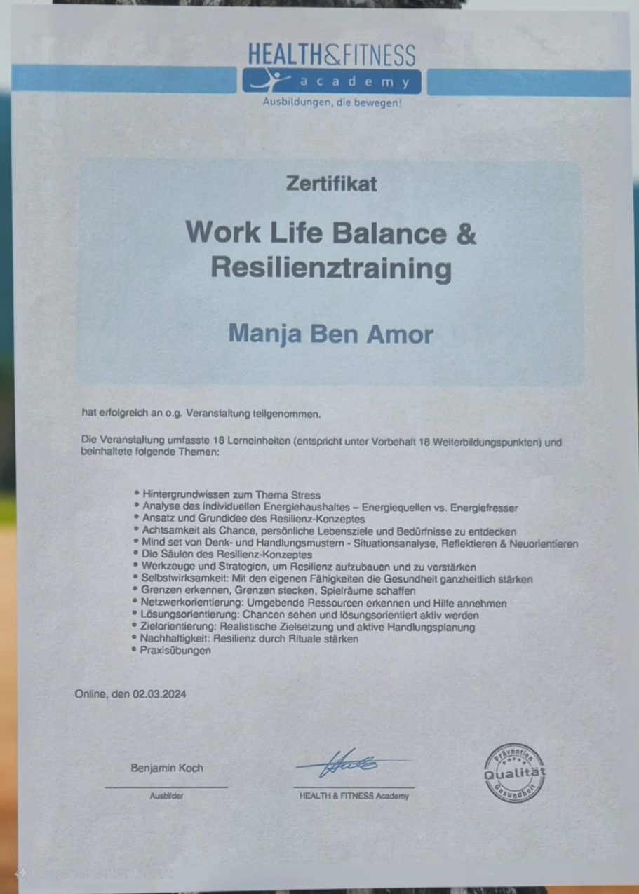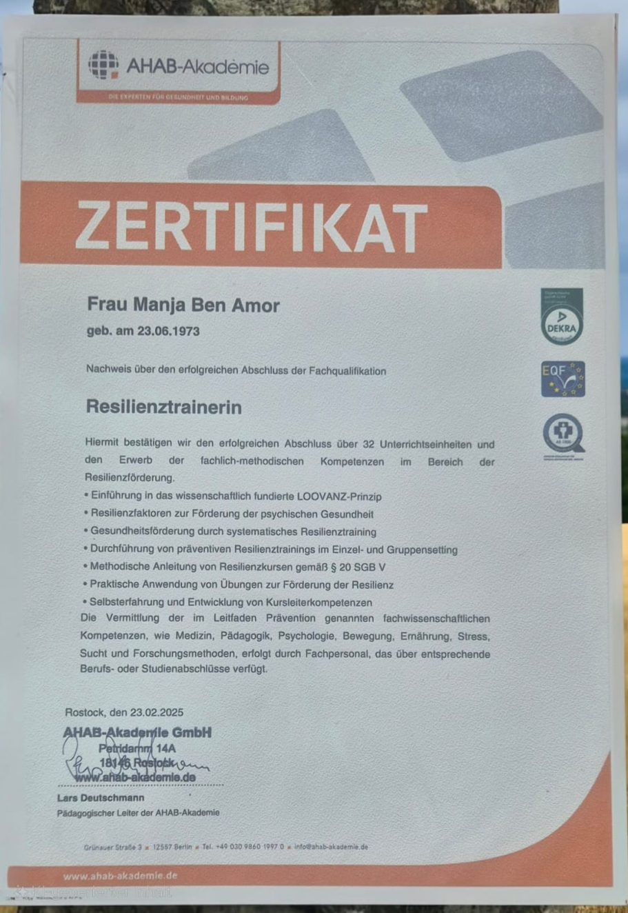 Jeder meiner Abschlüsse und Zertifikate ist nicht nur ein Stück Papier, er steht für jahrelanges Lernen, Praxis und Erfahrung. Mit diesem Wissen begleite ich dich einfühlsam, klar und lösungsorientiert auf deinem Weg zu mehr Resilienz, innerer Stärke und Lebensfreude. Auf mich kannst du zählen, mit Herz, Kompetenz und Engagement.