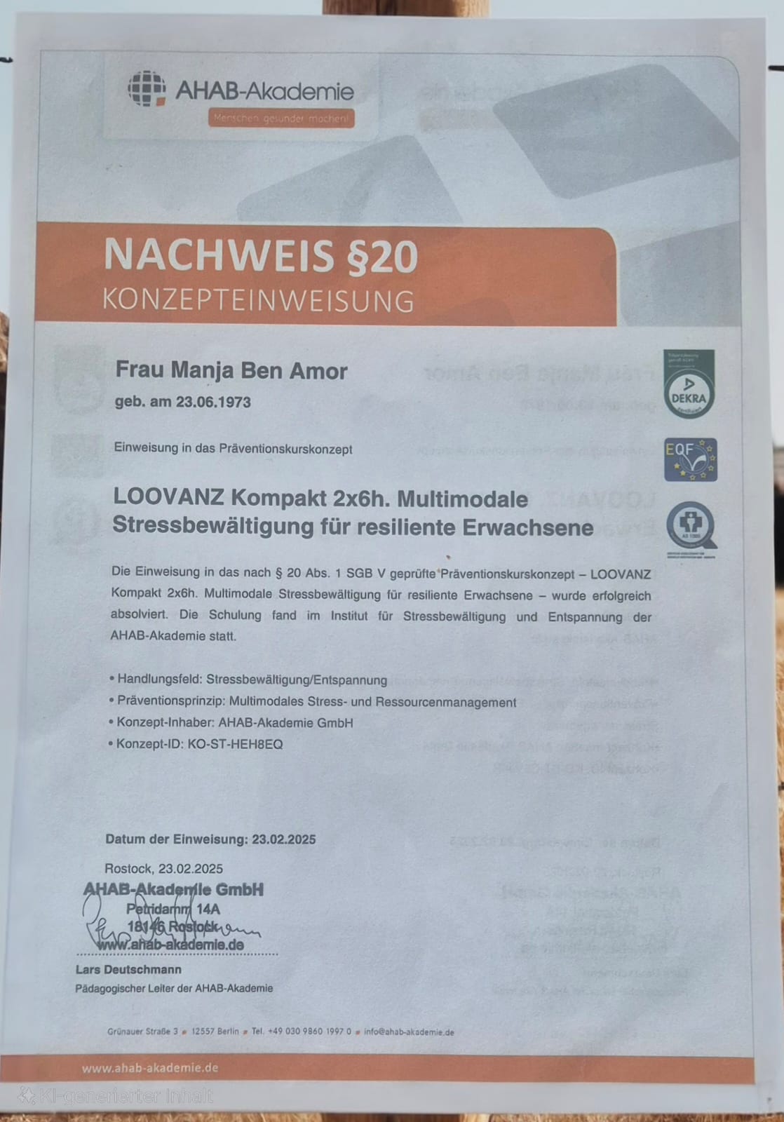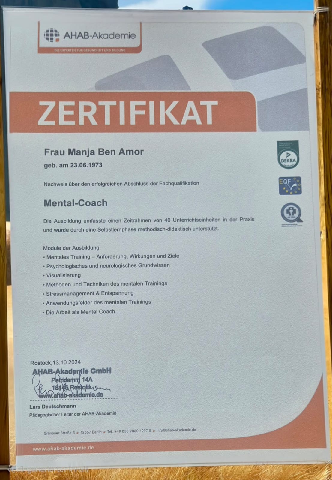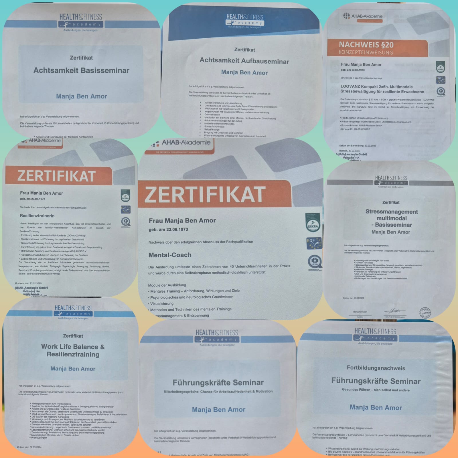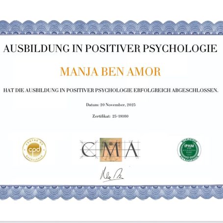 Jeder meiner Abschlüsse und Zertifikate ist nicht nur ein Stück Papier, er steht für jahrelanges Lernen, Praxis und Erfahrung. Mit diesem Wissen begleite ich dich einfühlsam, klar und lösungsorientiert auf deinem Weg zu mehr Resilienz, innerer Stärke und Lebensfreude. Auf mich kannst du zählen, mit Herz, Kompetenz und Engagement.