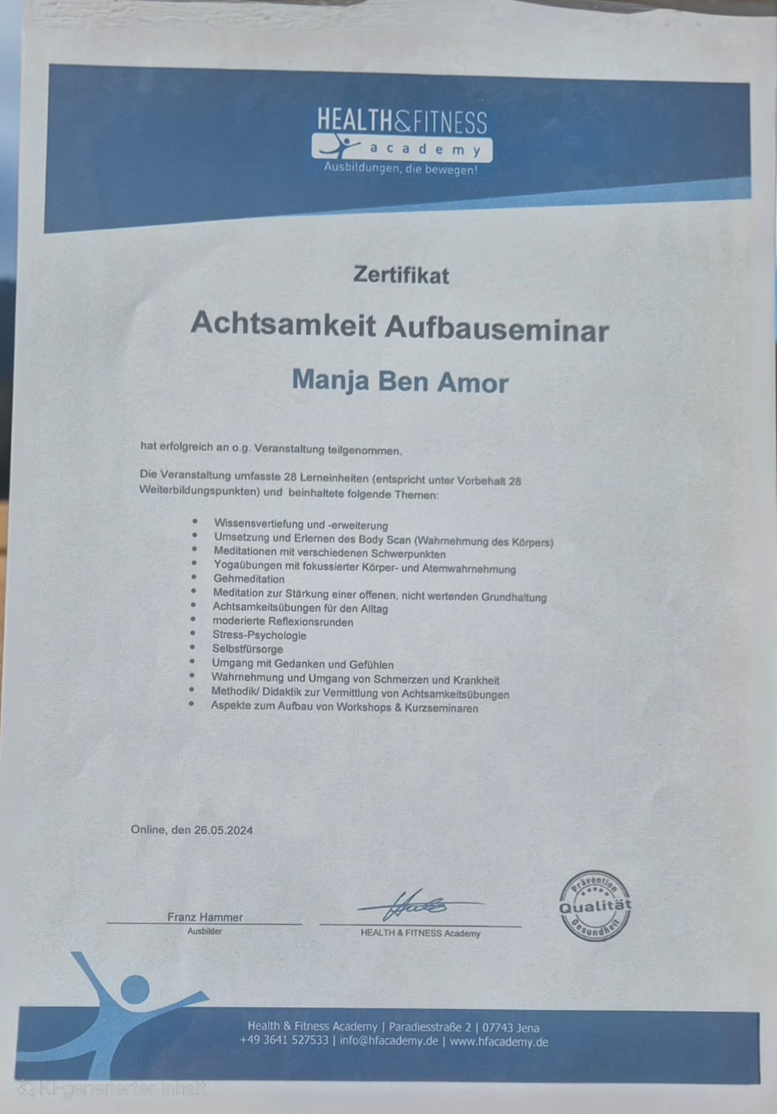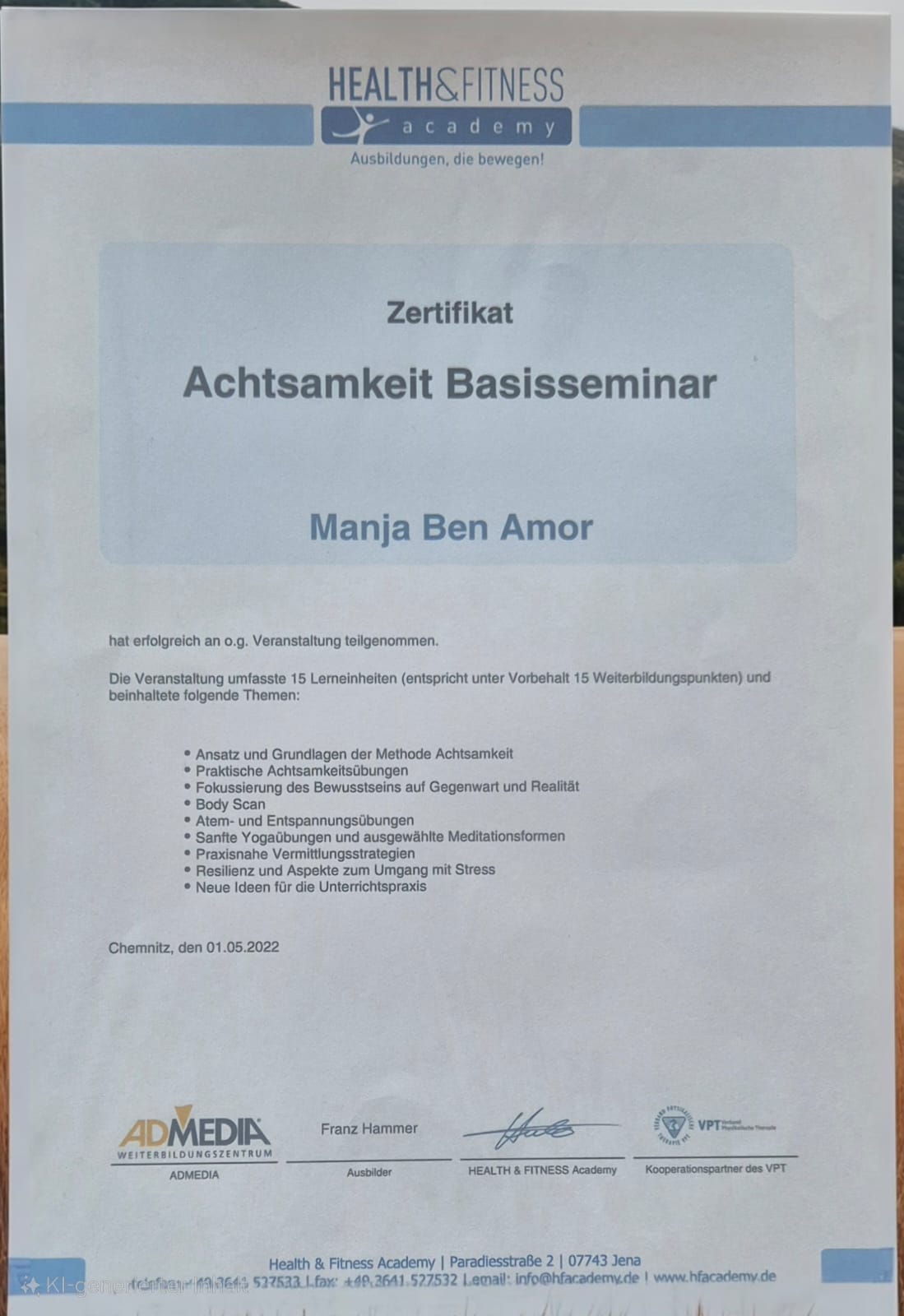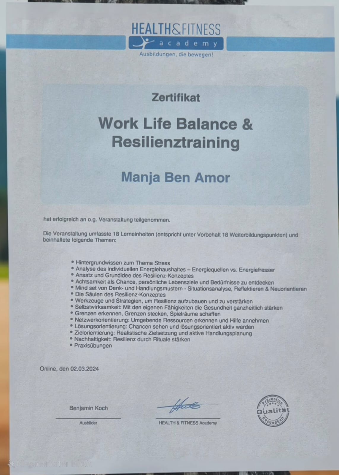 Jeder meiner Abschlüsse und Zertifikate ist nicht nur ein Stück Papier, er steht für jahrelanges Lernen, Praxis und Erfahrung. Mit diesem Wissen begleite ich dich einfühlsam, klar und lösungsorientiert auf deinem Weg zu mehr Resilienz, innerer Stärke und Lebensfreude. Auf mich kannst du zählen, mit Herz, Kompetenz und Engagement.
